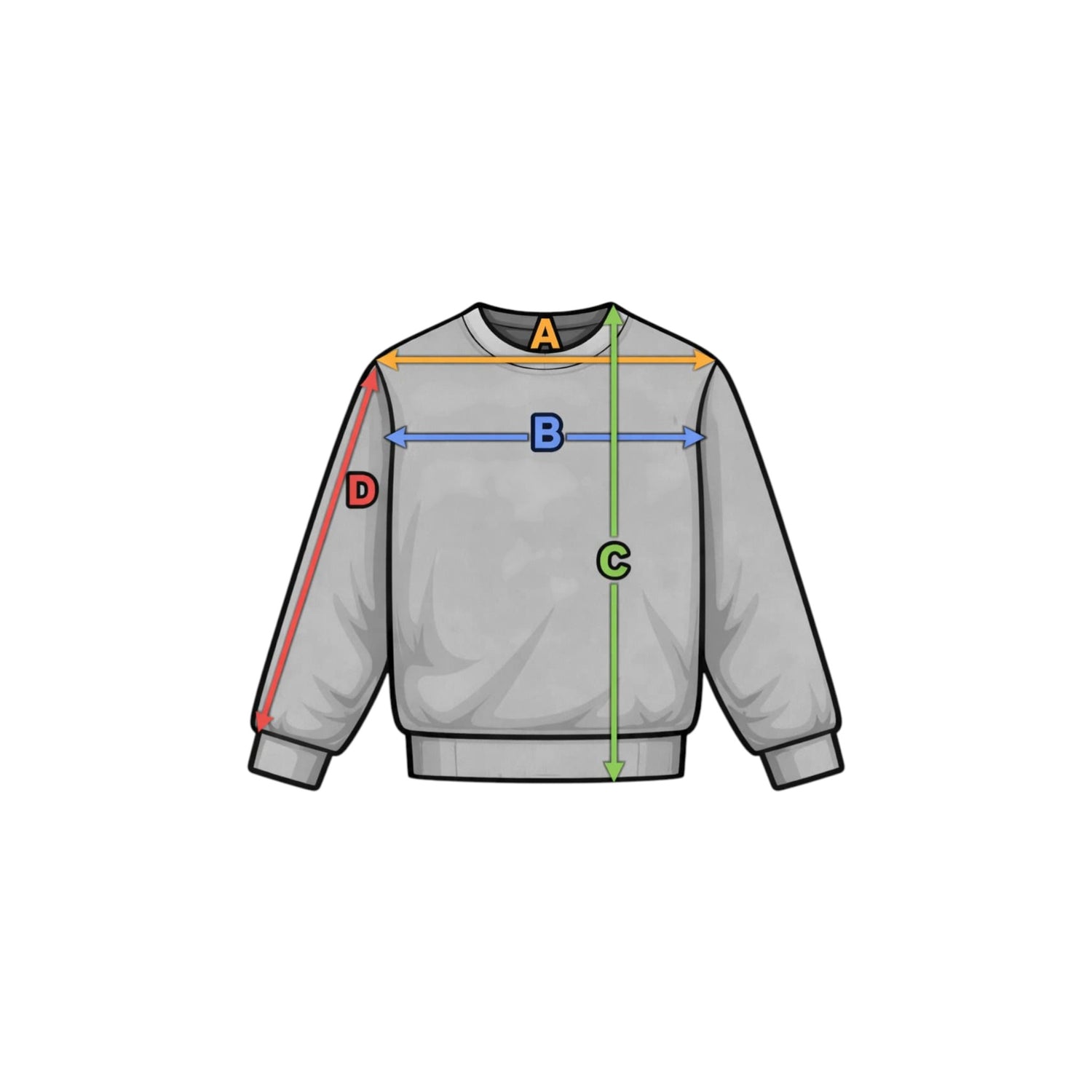 Der Pullover wird glatt und flach liegend in seiner natürlichen Form gemessen, ohne das Material zu dehnen.